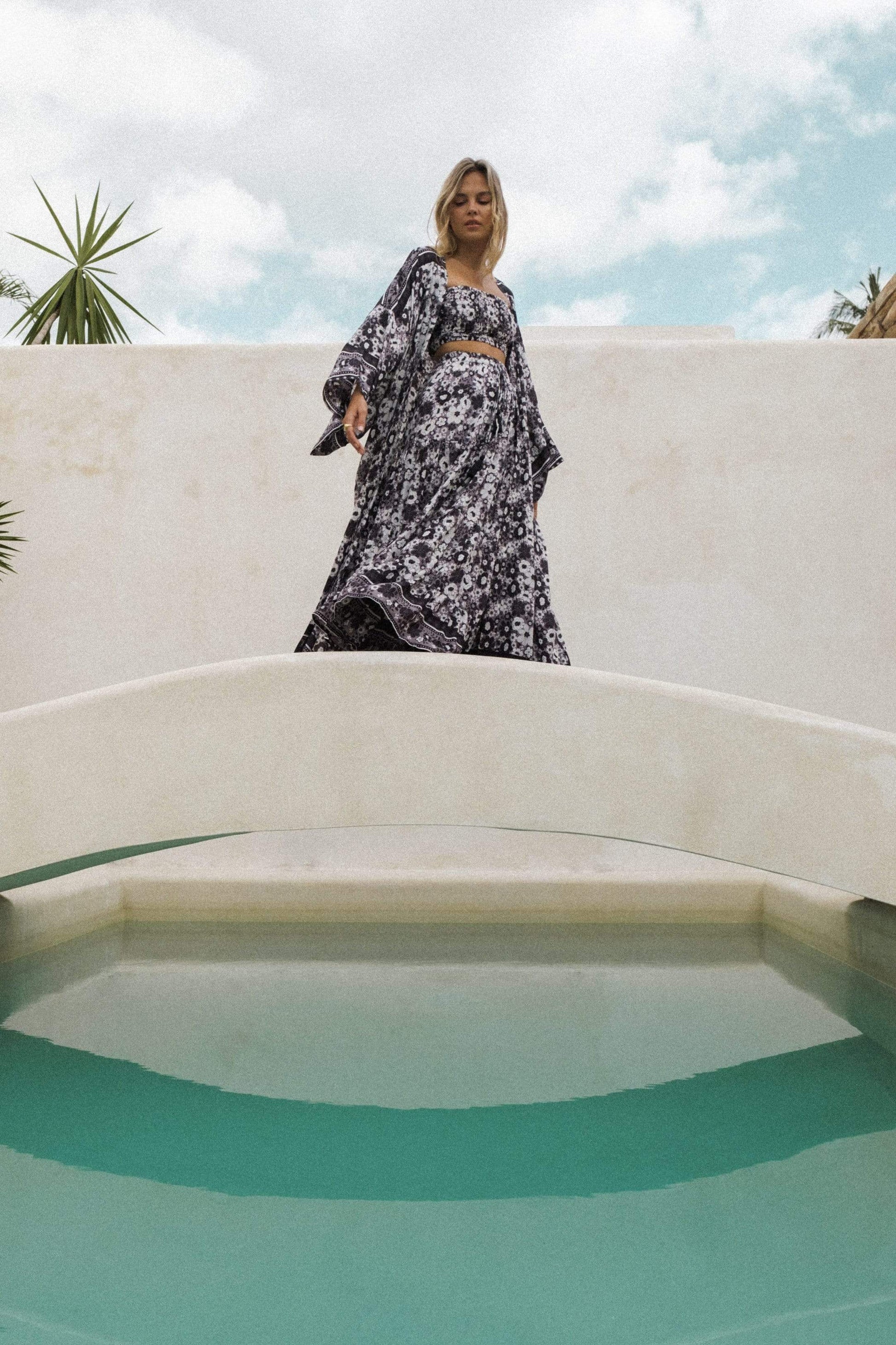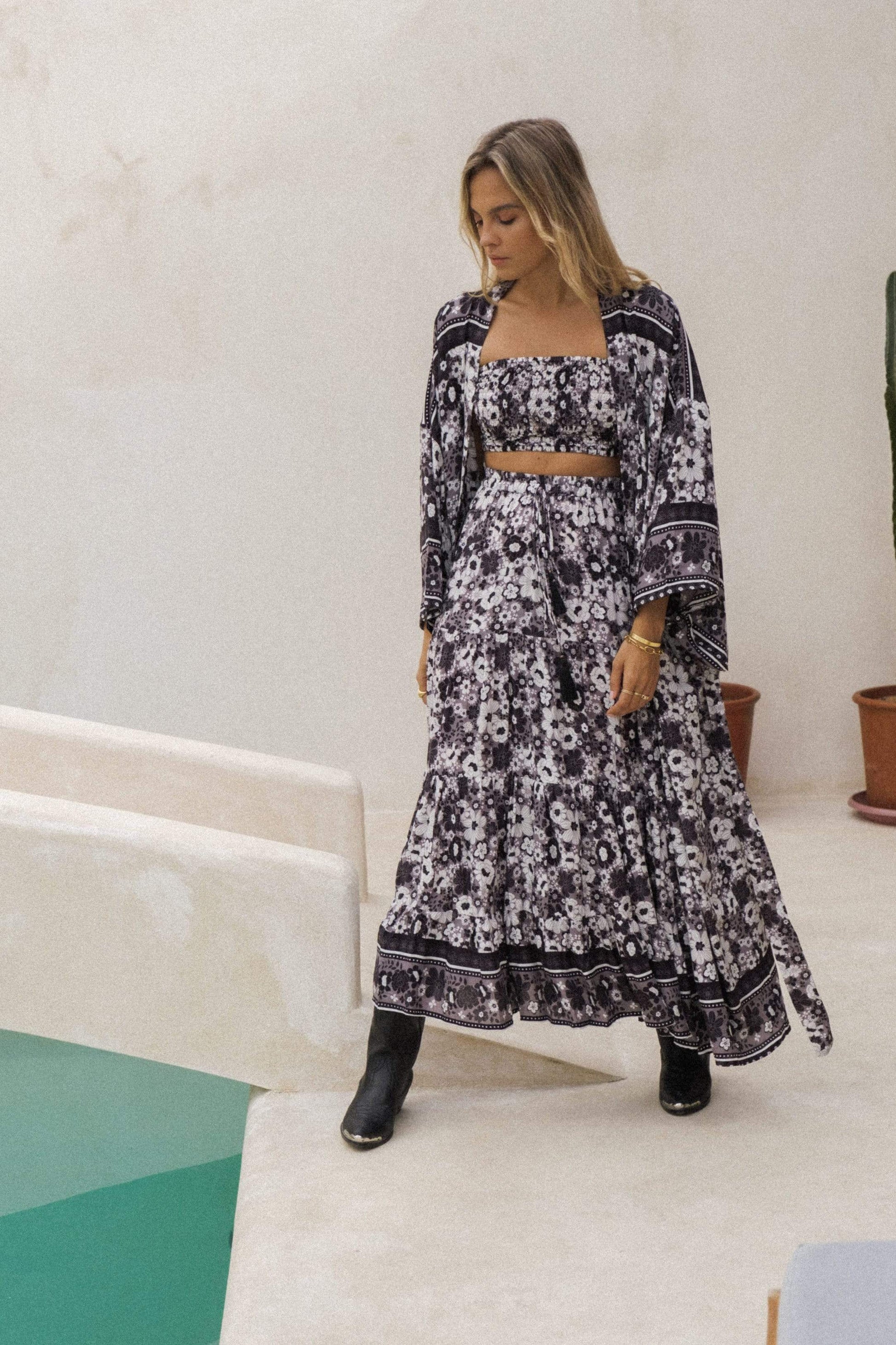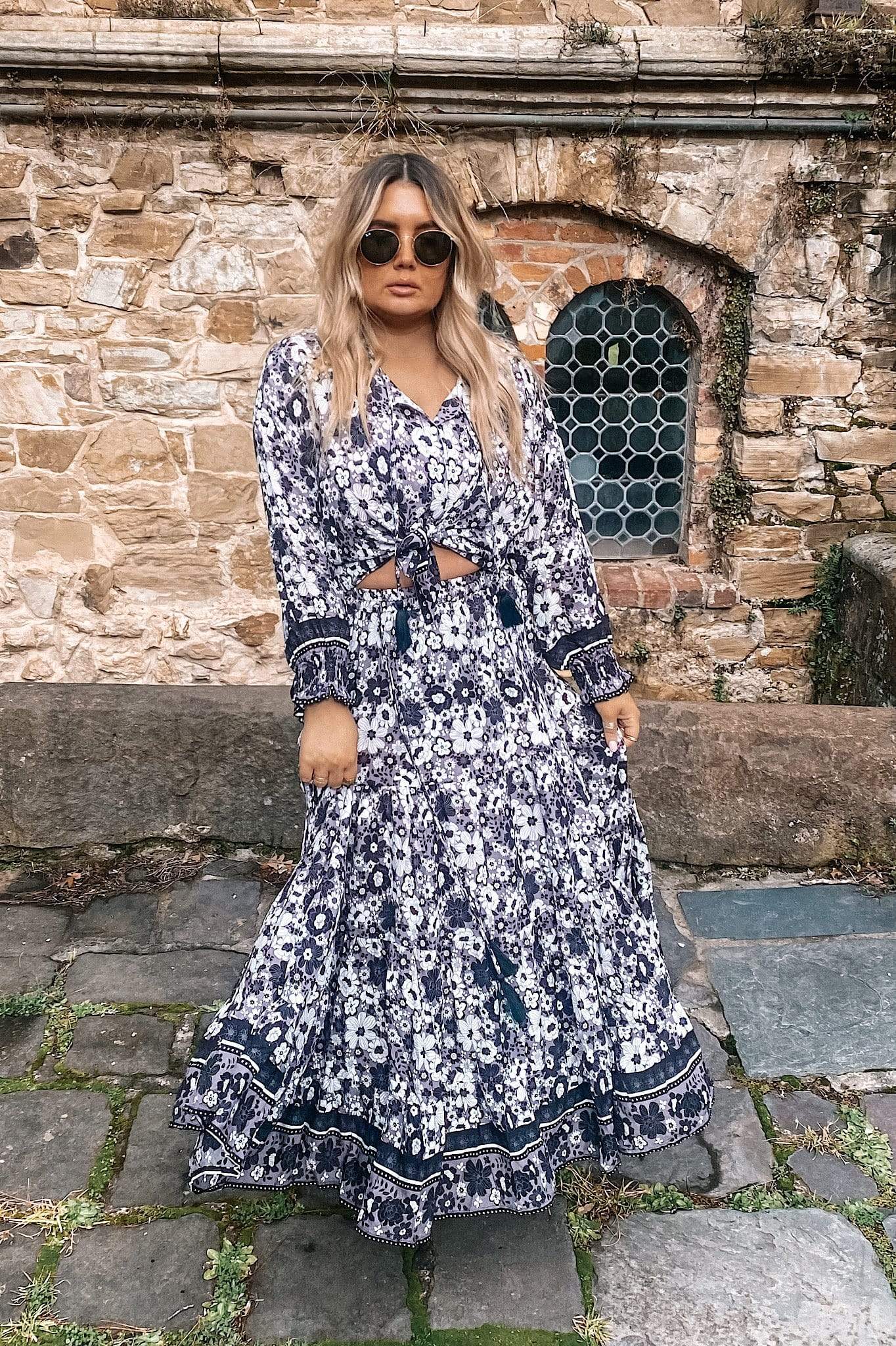 You will be enchanted by the Stardust Maxi Skirt. Each tier of its hem is constructed to flow, with a draw string elasticated waist that ties the look together. The piece is delicately detailed with brass beads and tassels. Matches perfectly with our co-ord bandeau.